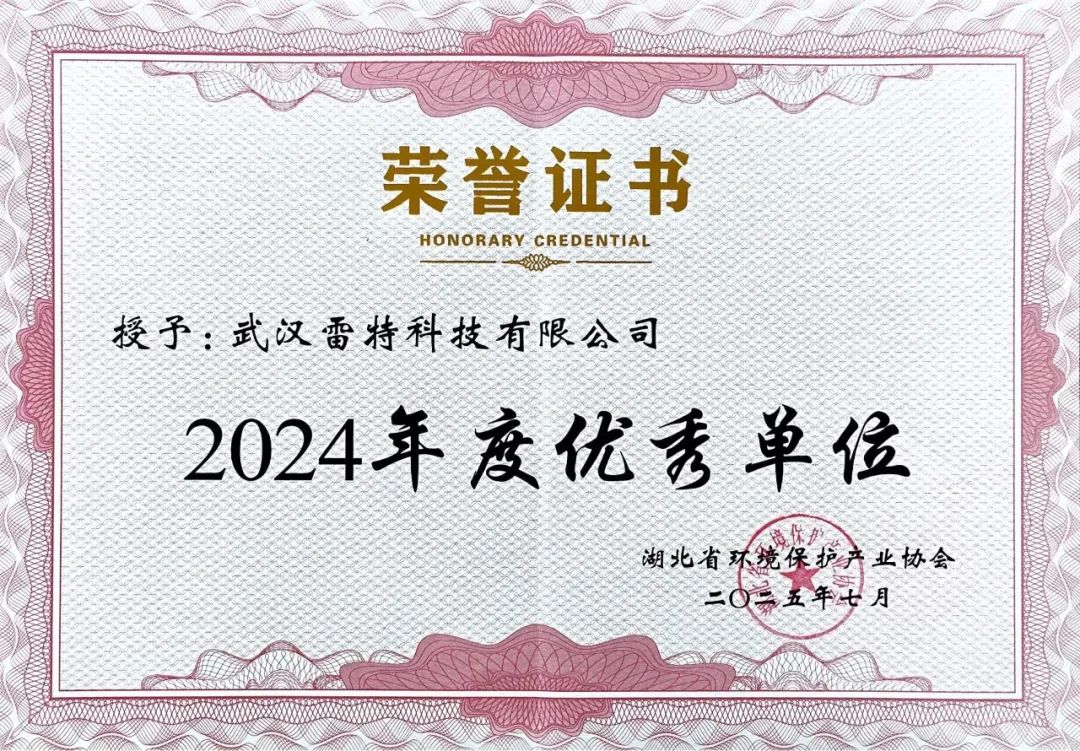 2025年7月29日,在“2025湖北省环境保护产业协会工作会暨第五届四次会员代表大会”上,武汉雷特科技有限公司荣获“2024年度优秀单位”称号,这一荣誉是对雷特科技在环境保护领域做出突出贡献的高度认可。