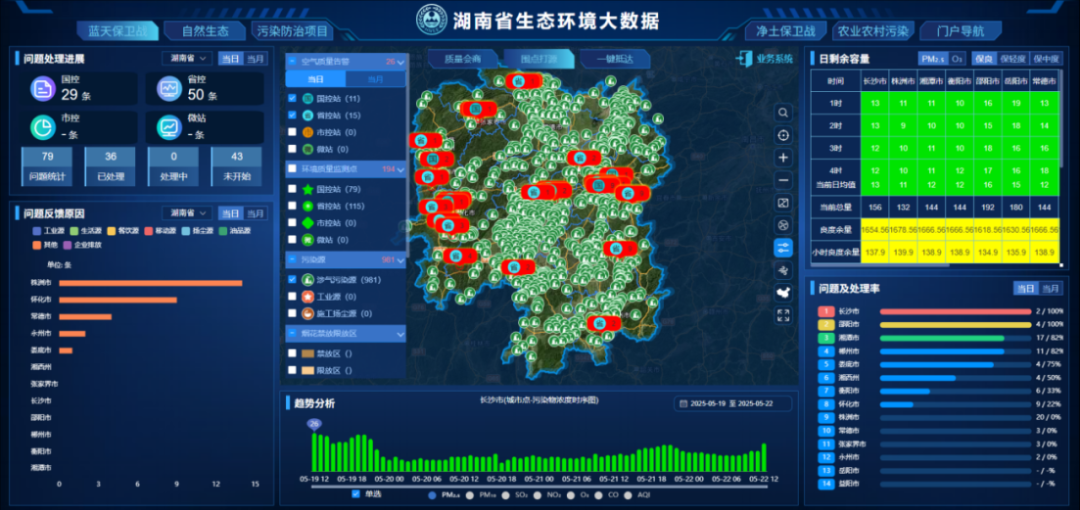 “蓝天保卫战”大数据平台,基于生态环境数据资源中心,整合大气污染源清单数据、立体监测网络数据、移动源数据等,开展大气污染防治大数据分析,通过大气污染物排放特征分析、区域大气污染传输规律分析、关键大气污染因子识别、重点污染应对以及大气环境敏感点识别,实现空气质量重污染天气预警预报、一键抵达、关联分析、执法联动、复盘评估等应对闭环管理;基于识别的大气环境敏感点,特别是高值站点,精准筛选站点周边1~5km范围内的污染源信息,结合分析模型,锁定疑似污染来源企业和点位,生成重点污染源管控清单,指导开展污染现场排查和治理工作,最终实现大气环境报警信息推送、现场巡查、处置及执法的全闭环管理。