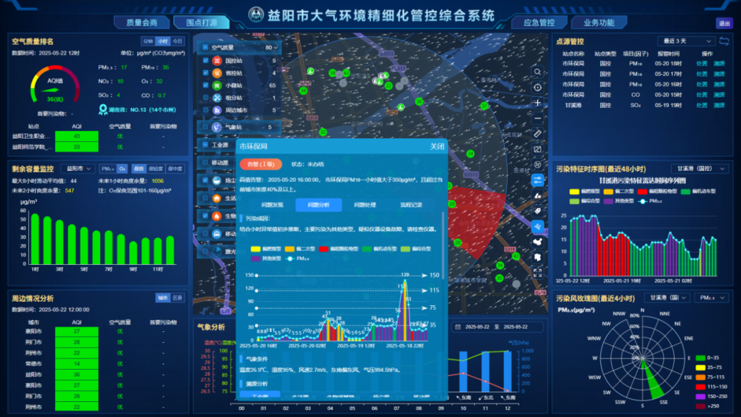 多源数据融合及大气环境精细化管控平台,全面融合全域范围内国控站、省控站、小微站、组分站、园区站、气象站、重点涉气污染源在线、餐饮油烟、加油站、工地扬尘、铁塔视频火点监控、固定遥感、OBD、源清单等大气多源数据,形成不同维度的环境空气质量分析、评价、排名等综合分析结果和展示效果,指导开展日常的空气质量会商和综合研判;通过高值热点报警、污染溯源、分析研判、污染排查、反馈机制及网格化管理,实现污染源精细化、常态化管控,指导形成高效的重污染天气应对管控机制,为打赢打好蓝天保卫战提供支撑。