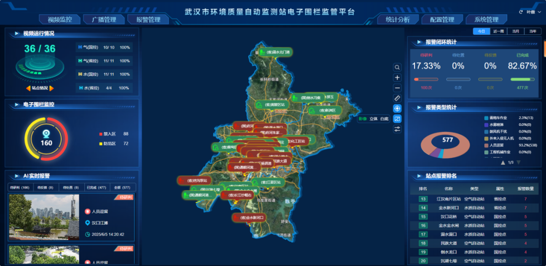 环境质量自动监测站电子围栏监管平台,运用物联网、大数据、云计算、3S、视频监控、人工智能等新信息技术手段,在环境空气质量自动监测站点和地表水环境质量自动监测站点及取水口周边区域设置电子围栏,进行24小时全天候、360全方位视频监控,新研发10多种人为干扰行为的算法,对可能影响监测站点正常运行的人员逗留、雾炮车作业、水雾喷淋、鼓风机干扰、外来入侵无人机、工程机械作业、水面异物、监测设施位移、水体变化、轮船通航、非运维人员入侵等异常情况进行AI智能监控、自动识别和报警,并自动记录保存相关视频证据。