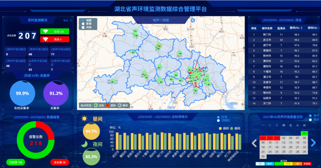声环境监测数据综合管理平台,积极响应和落实《“十四五”噪声污染防治行动计划》,将声环境质量监测管控与数据互联共享相结合,实现噪声自动监测数据统一集成和汇聚,完成数据的接入、清洗、监控及管理,并将数据统一共享到省厅数据资源中心,实现全省所有噪声自动监测站点的数据采集、噪声监测数据实时监控和预警、统计分析、污染溯源等,为生态环境部门开展声环境监测数据管理和声环境质量评价提供有力的数据支撑和技术保障。