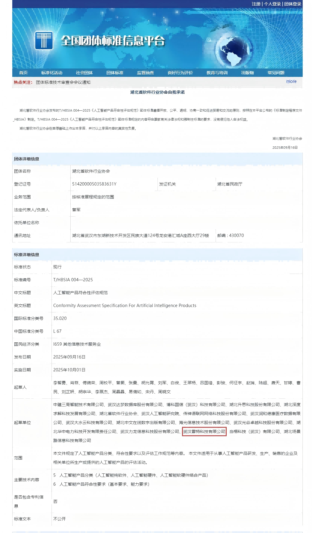 在这一具有里程碑意义的标准制定过程中,武汉雷特科技有限公司作为主要起草单位,发挥了不可替代的作用。公司凭借在人工智能领域的卓越创新与行业引领,深度参与《人工智能产品符合性评估规范》团体标准制定,为规范行业发展、推动人工智能技术在相关领域的高质量应用贡献了“雷特智慧”。