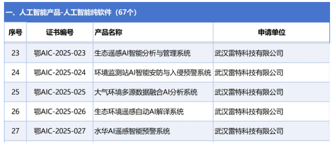 2025年11月28日,湖北省软件行业协会正式发布《2025年度湖北省人工智能产品评估结果(第一批)》,武汉雷特科技有限公司凭借在人工智能与生态环境领域的深度创新,自主研发的生态遥感AI智能分析与管理系统、环境监测站AI智能安防与入侵预警系统、大气环境多源数据融合AI分析系统、生态环境遥感自动AI解译系统、水华A1遥感智能预警系统等5款软件产品,通过严格评估,成功获得《人工智能产品证书》。这一成果标志着武汉雷特在人工智能技术标准化、产品化领域取得新的进展和突破,为湖北省人工智能产业高质量发展注入强劲动能。